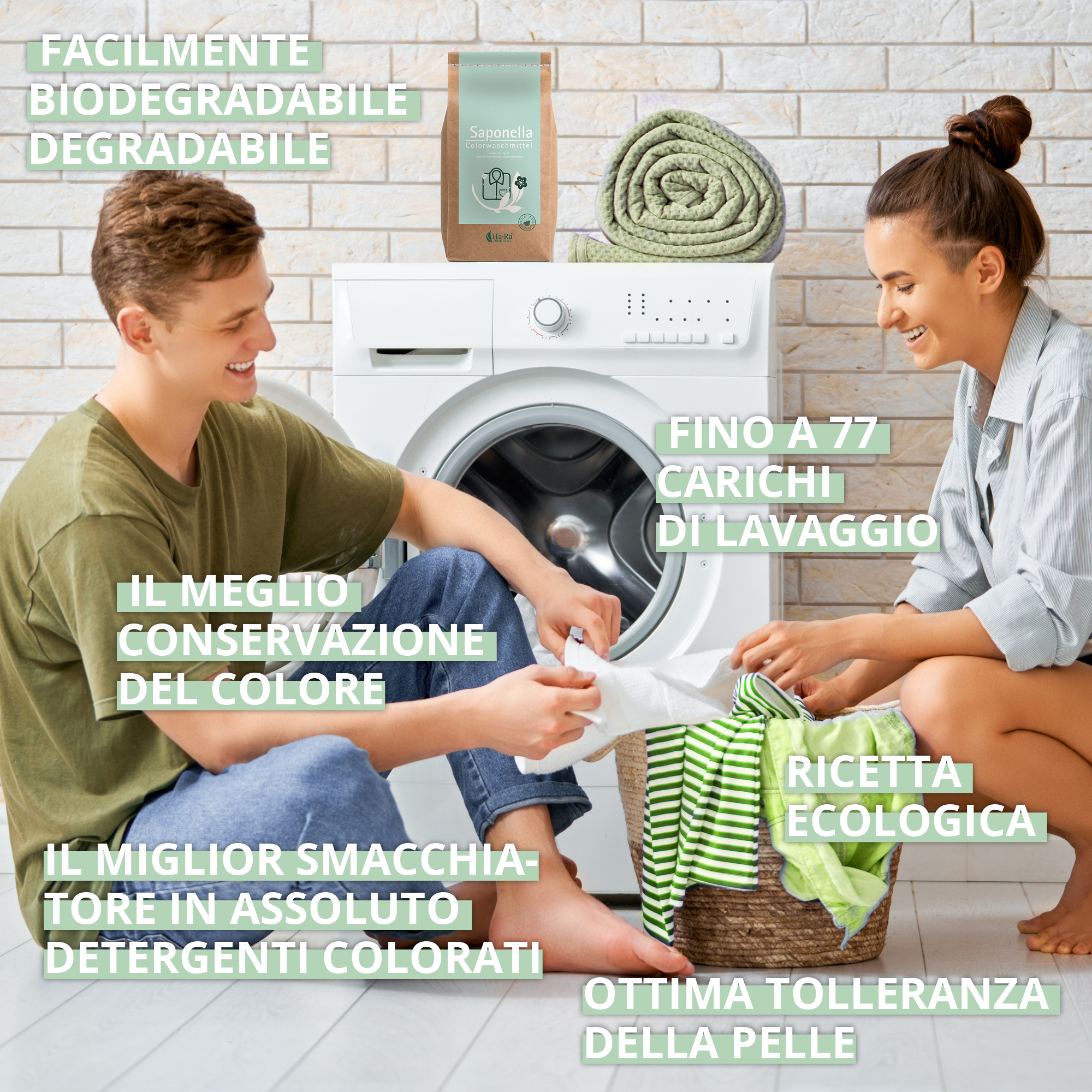 Pulizia dei colori in lavatrice. Ideale per la pulizia delle fibre Ha-Ra. Non adatto per lana e seta. CONSIGLIO: Per i bucato bianco consigliamo il detersivo per uso intensivo Saponella Ha-Ra.